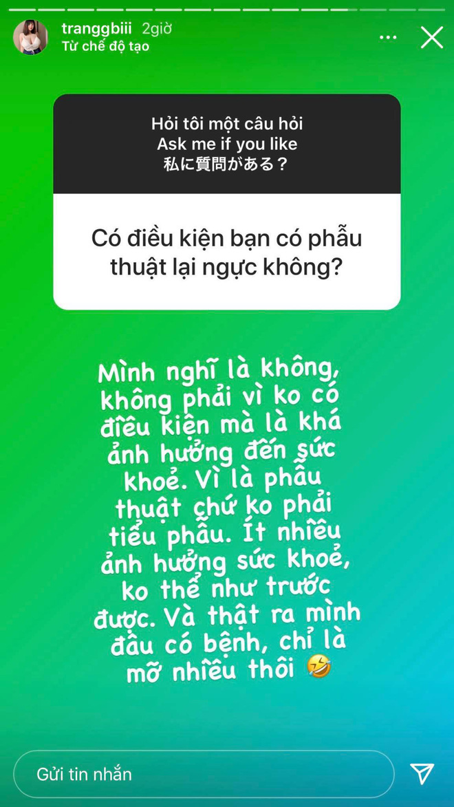 Còn với câu hỏi "Có điều kiện bạn có phẫu thuật lại ngực không?", cô nàng cũng không ngại trả lời: "Mình nghĩ là không. Không phải vì không có điều kiện mà là khá ảnh hưởng đến sức khoẻ. Vì là phẫu thuật chứ không phải tiểu phẫu, ít nhiều ảnh hưởng sức khoẻ, không thể như trước được. Và thật ra mình đâu có bệnh, chỉ là mỡ nhiều thôi".