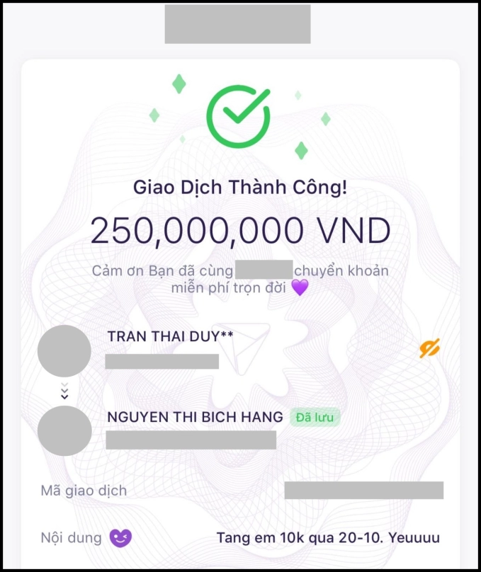Nhưng phần chính mới thực sự khiến dân tình bất ngờ và ghen tỵ với nữ doanh nhân. Cụ thể, Duy Trần tự tay sắp xếp lại bàn trang điểm của Hằng Túi cho gọn gàng, và "ting ting" ngay vào tà khoản của vợ 250 triệu đồng làm quà ngày 20-10. Có thể nói, đây là món quà chất lượng bậc nhất ngày Phụ nữ Việt Nam năm nay.