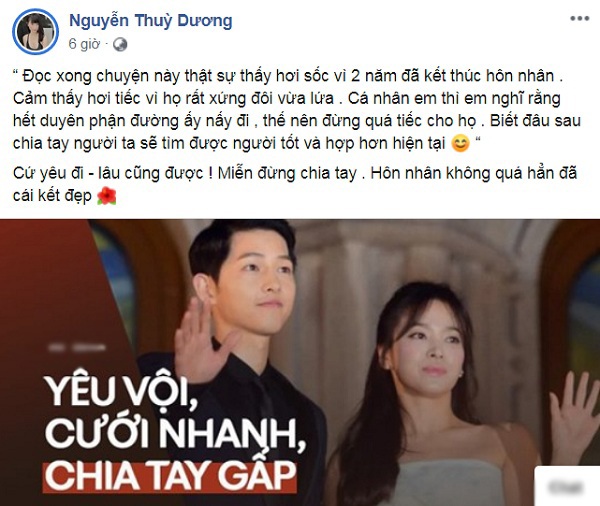 Trên trang facebook cá nhân của mình, Nguyễn Thùy Dương - bạn gái xinh đẹp của cầu thủ Huy Hùng chia sẻ rằng, cô nàng cảm thấy sốc nhưng không quá tiếc cho chuyện tình của cặp diễn viên đình đám Hàn Quốc.