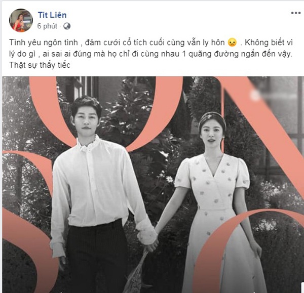 Còn với nữ diễn viên trẻ Liên Tít, cô cảm thấy tiếc nuối cho chuyện tình yêu đậm chất ngôn tình trước đó và đám cưới cổ tích của cặp đôi Song-Song từng khiến dân mạng không khỏi trầm trồ, ngưỡng mộ.