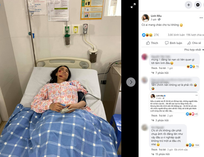 Hình ảnh nhập viện bên cạnh máy đo điện tim do tự cô nàng đăng tải trên trang cá nhân với dòng trạng thái: "Có ai mang cháo cho tui không?" thu hút sự quan tâm của đông đảo dư luận. Mặc dù chưa rõ nguyên nhân về những thương tích xuất hiện trên mặt hot girl Linh Miu thế nhưng cộng đồng mạng không khỏi bàn tán xôn xao.