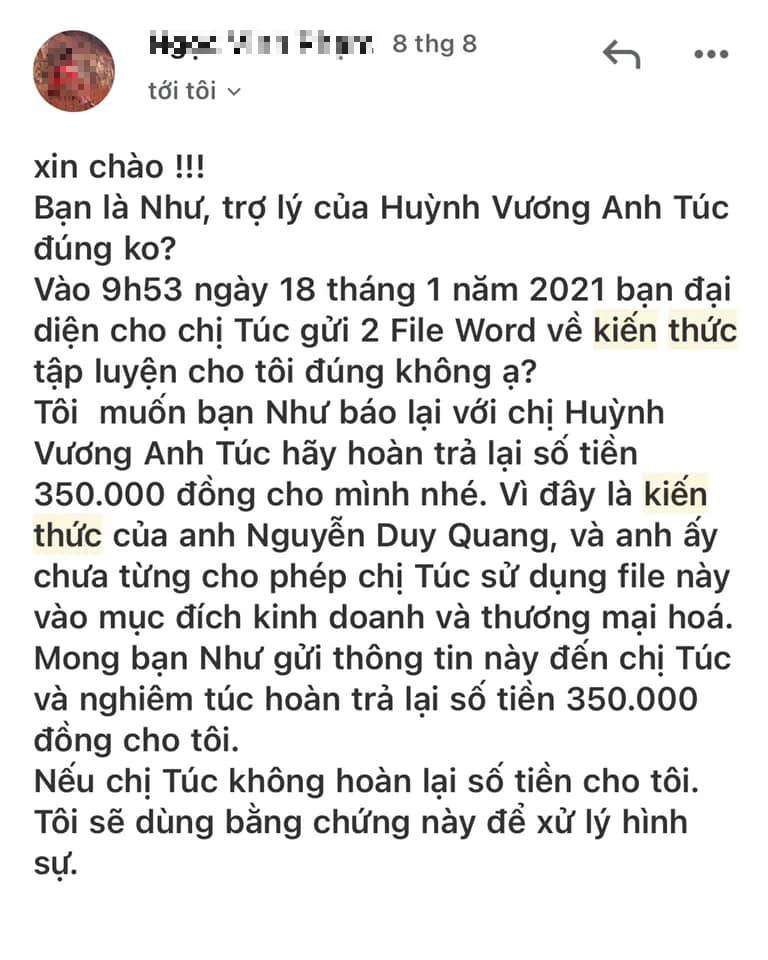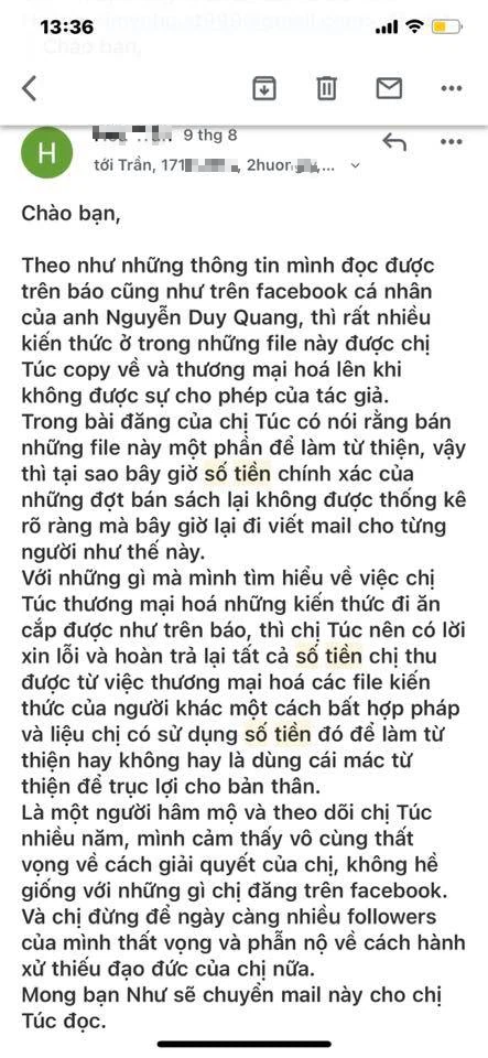 Câu chuyện sẽ nhanh rơi vào quên lãng nếu như cô không dùng những kiến thức thu thập được từ các tiền bối để tổng hợp thành file tài liệu đem bán. HLV Nguyễn Duy Quang chia sẻ: "Mình chưa từng cho phép HLV Tố Như lấy lại bài của mình, càng không cho phép cô sử dụng y nguyên tài liệu đó vào một cuốn sách tổng hợp để đem bán dù là với mục đích gì chăng nữa".
