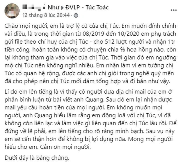 Với nhiều người, số tiền này không quá lớn nhưng thử hình dung xem, cô đã bán cho hàng nghìn người thì số tiền thu về cũng không phải là nhỏ, có thể lên đến hàng trăm triệu đồng. Điều này cũng được những người trong nhóm 2000 người thuộc nhóm "ĐVLP – Túc Toác" từng mua file xác nhận.