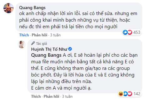 Trước lời xin lỗi, HLV Nguyễn Duy Quang trả lời anh đồng ý lời xin lỗi của đàn em vì sai có thể sửa nhưng HLV Huỳnh Thị Tố Như phải công khai minh bạch những vụ từ thiện hoặc nếu được thì phải trả lại tiền cho mọi người. Đáp lại yêu cầu của đàn anh, cô bình luận bằng câu không thể chắc chắn hơn: "Em sẽ hoàn lại phí cho các bạn mua file muốn nhận bằng tất cả khả năng em có thể" rồi cảm ơn HLV Nguyễn Duy Quang và "cảm ơn mọi người".