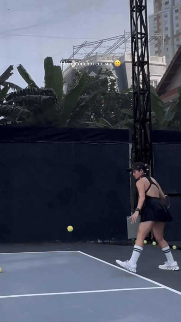 Theo đó giống hội chị em ra sân, Thủy Top cũng lựa chọn trang phục sành điệu, vừa phục vụ việc tập luyện nhưng vẫn phải khoe được vóc dáng. Cô diện trang phục tone đen, váy ngắn, phía sau lưng được cut-out khéo léo. Tuy nhiên, như sợ vướng vào “tầm ngắm” của dân mạng, Thủy Top cũng nhanh chóng bày tỏ lý do đến với pickleball.