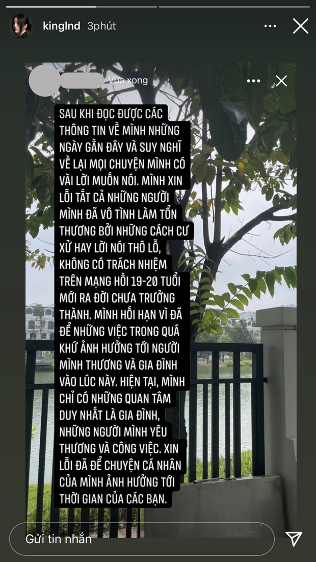 "Sau khi đọc được các thông tin về mình những ngày gần đây và suy nghĩ lại mọi chuyện, mình có vài lời muốn nói. Mình xin lỗi tất cả những người mình đã vô tình làm tổn thương bởi cách cư xử hay lời nói thô lỗ, không có trách nhiệm trên mạng hồi 19-20 tuổi mới ra đời, chưa trưởng thành. Mình hối hận vì những việc trong quá khứ đã ảnh hưởng tới người mình thương và gia đình vào lúc này. Hiện tại mình chỉ có những quan tâm duy nhất là gia đình, những người mình yêu thương và công việc. Xin lỗi đã để chuyện cá nhân của mình ảnh hưởng tới thời gian của các bạn".