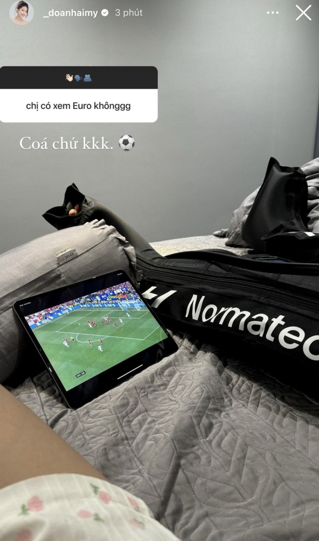 Dẫu vậy, cô nàng vẫn dành thời gian để theo dõi trận đấu tại Euro 2024. Đúng chuẩn vợ của cầu thủ nên cô nàng cũng vô cùng yêu bóng đá. Gần 1h sáng ngày 23/6, Hải My vẫn thức xem trận đấu Bồ Đào Nha thắng 3-0 Thổ Nhĩ Kỳ.