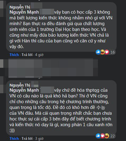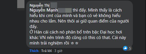 Bằng nhiều luận điểm, ý kiến của M.T được nhiều cư dân mạng đồng tình hơn. Trong khi đó T.T vẫn quả quyết cho rằng, mình đã học cấp 3 ở cả Hàn và Việt Nam nên biết rõ được khối lượng kiến thức của học sinh Hàn như nào.