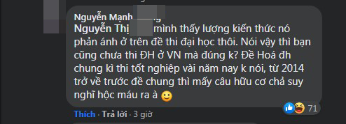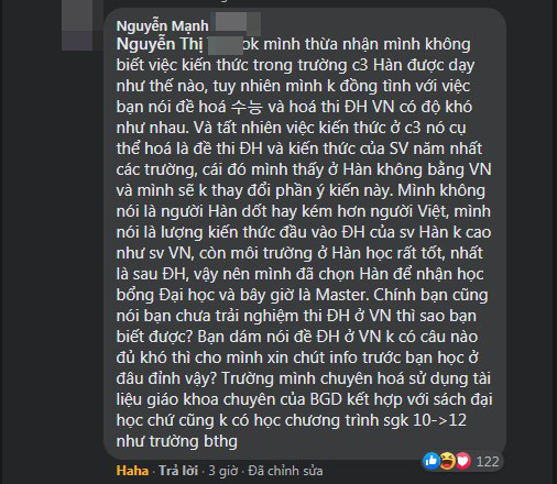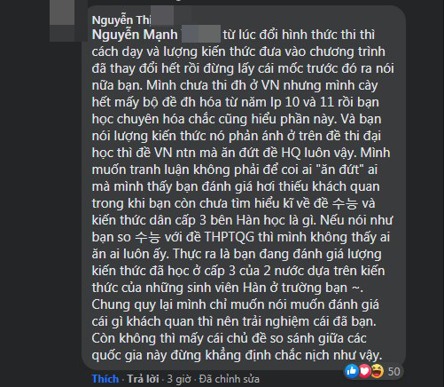 Tuy nhiên M.T cũng nhanh chóng đáp trả. Du học sinh này cho rằng lượng kiến thức của học sinh Hàn phản ánh trên chính đề thi đại học. Và T.T cũng chưa hề thi đại học ở Việt Nam thì không tài nào biết được độ khó của đề thi ở quê hương. Là một học sinh chuyên Hóa, M.T nhận thấy đề thi Hóa ở Việt Nam có phần khó hơn so với đề thi ở Hàn. Theo du học sinh này, kiến thức đầu vào đại học của sinh viên Hàn không cao như sinh viên Việt Nam. Còn môi trường đại học ở Hàn rất tốt, nhất là môi trường sau đại học.
