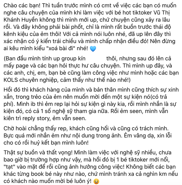 Mới đây, netizen xôn xao trước bài đăng của M.C - một người làm việc lâu năm trong lĩnh vực booking KOLs, bất ngờ tố hot TikToker Vũ Thị Khánh Huyền về thái độ làm việc thiếu chuyên nghiệp và có phần mắc bệnh ngôi sao.