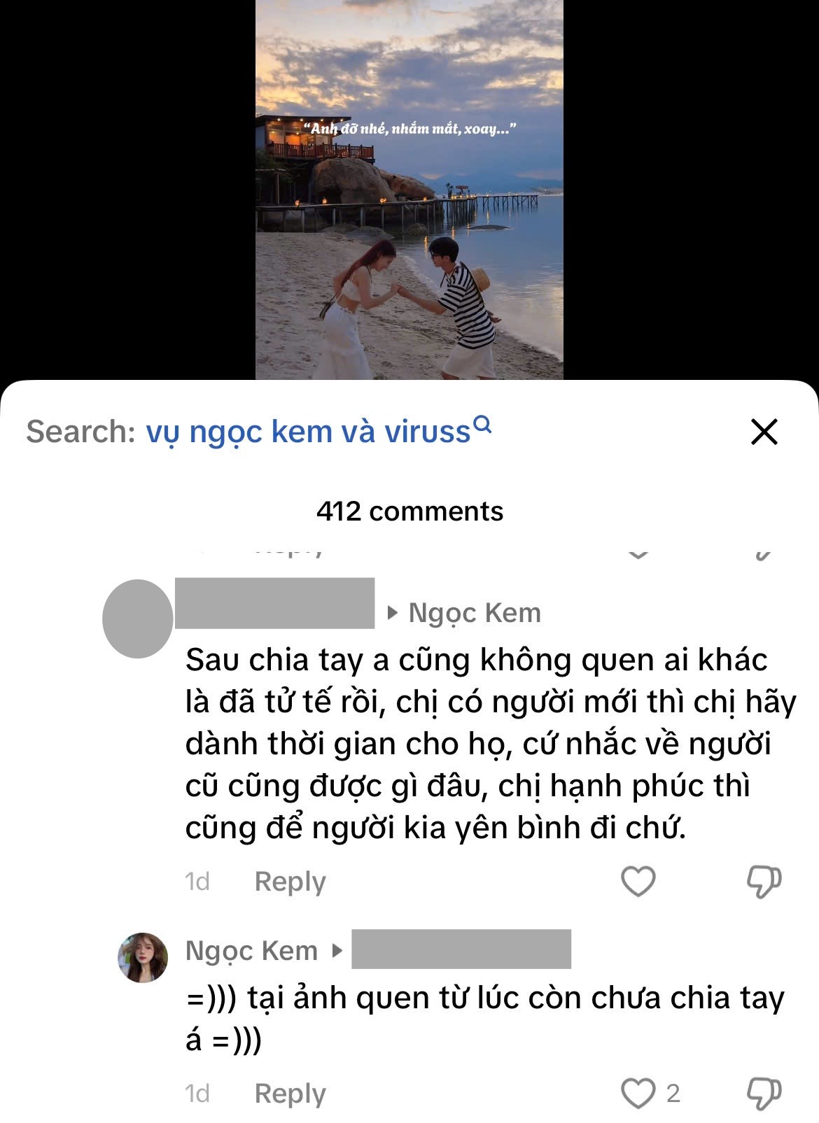 Chẳng hạn như việc cô nàng like một bình luận: "Ổng cắm cho bả cái sừng dài 8m luôn mà". Và khi một netizen bình luận dưới video của Ngọc Kem rằng: "Sau chia tay anh cũng không quen ai khác là đã tử tế rồi, chị có người mới thì hãy dành thời gian cho họ..." thì hot girl liền đáp trả: "Tại anh quen từ lúc chưa chia tay á".