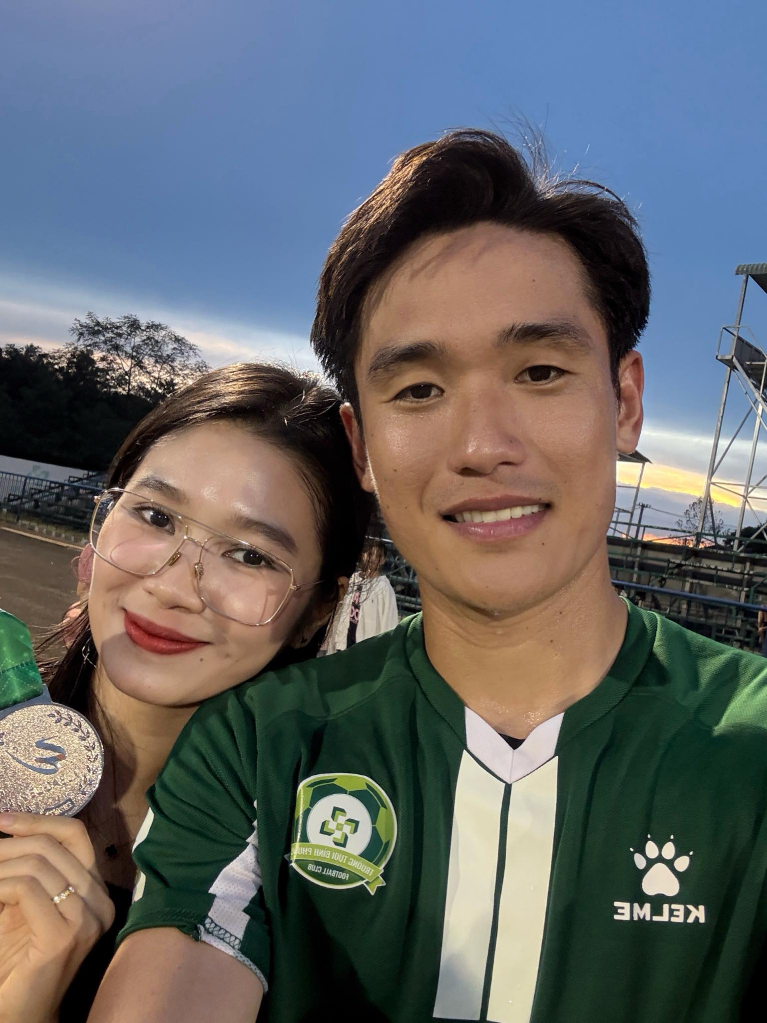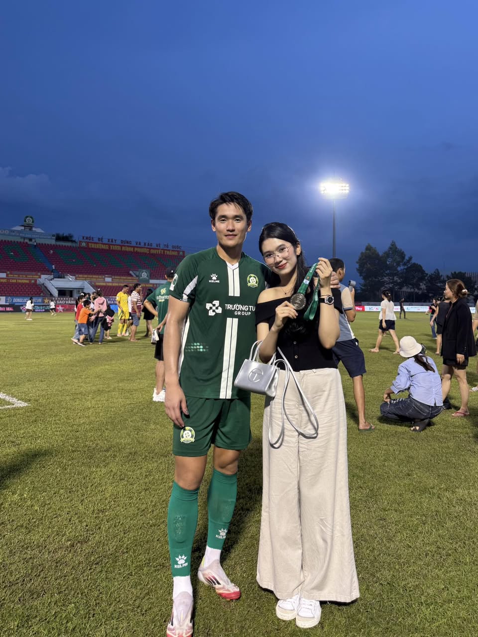 Sau trận đấu, BTC đã trao huy chương bạc cho đội bóng này, dàng WAG cũng có mặt để ăn mừng với nửa kia của mình. Sự xuất hiện của cô nàng Trâm Phạm lập tức gây chú ý. Hơn một năm qua do sinh em bé nên vợ của trung vệ Huỳnh Tấn Sinh hiếm khi xuất hiện trên sân vận động. Trong ngày đội bóng của chồng lần đầu tiên giành chức Á quân hạng Nhất, Trâm Phạm đã có mặt để cùng chia vui.