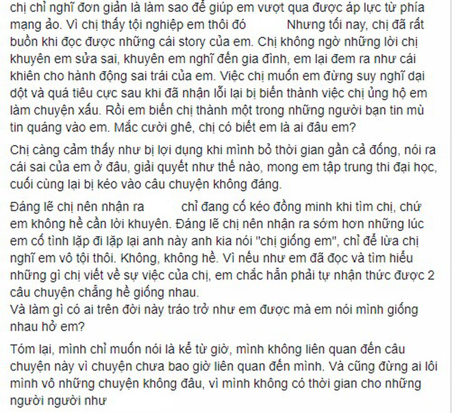 Những tưởng sau bức tâm thư xin lỗi trên trang cá nhân của B.B.N và status tha thứ của Trọng Nghĩa thì sự việc đã chấm dứt. Thế nhưng mới gần đây, một fanpage trên Facebook đã tiếp tục đăng đàn "vạch mặt" cô nữ sinh này là không biết hối lỗi và trước đó cũng từng đạo văn khá nhiều lần. Thậm chí, cô nàng còn lôi tên đàn chị Nguyễn Tường Lan Thy vào câu chuyện drama không hồi kết của mình, khiến "hotgirl ống nghiệm" phải đăng cả một status dài đáp trả và cho rằng nữ sinh này đã quá "tráo trở" khi lại đi so sánh mình giống với em ấy.