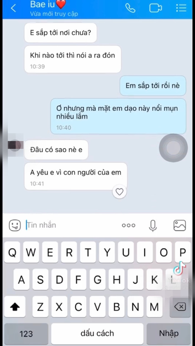 Ban đầu anh chàng tỏ ra rất vui mừng, còn căn dặn cẩn thận và hứa là sẽ đi đón cô gái. Khi bạn nữ nói là mặt nổi mụn thì người yêu vẫn vô cùng ngọt ngào nhắn: "Đâu có sao đâu nè em. Anh yêu em vì con người của em".