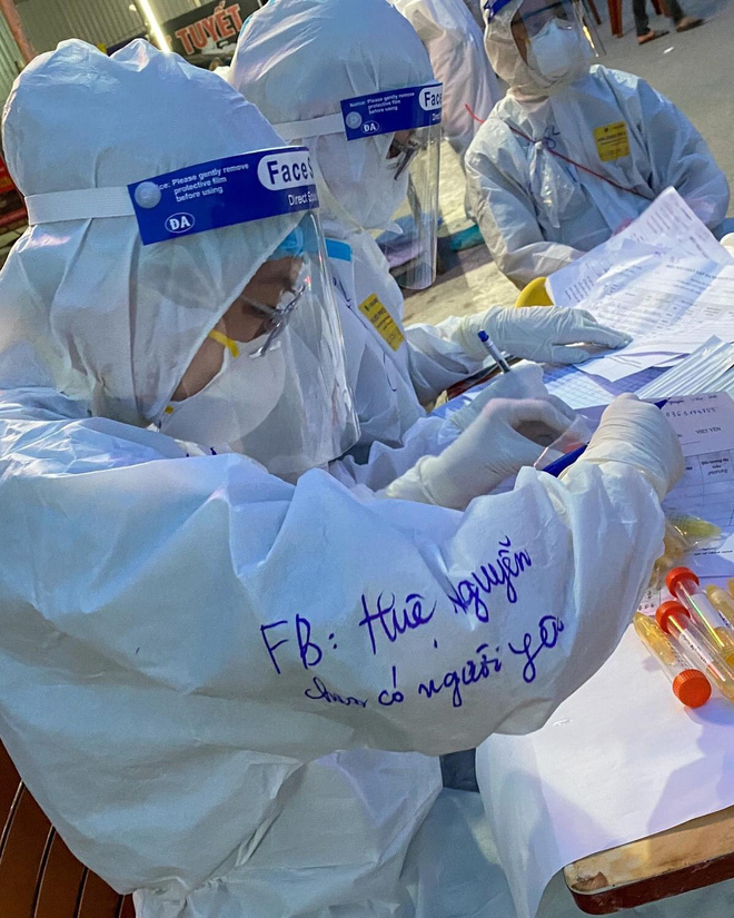 "Huệ Nguyễn - chưa có người yêu" là dòng chữ được viết bên ngoài bộ đồ bảo hộ kín bưng của Nguyễn Huệ, cô sinh viên năm cuối Học viện Y dược học cổ truyền Việt Nam đang tham gia chống dịch tại Bắc Giang.