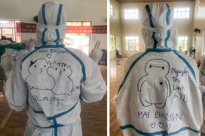 Cô Nhung cho biết các sinh viên đã dùng bút nhớ để viết, vẽ các thông điệp như: "Biệt đội săn COVID", "Mệt chỉ là cảm giác", "Huệ Nguyễn" chưa có người yêu... trên bộ đồ bảo hộ để dễ dàng nhận ra và cùng động viên nhau cố gắng.