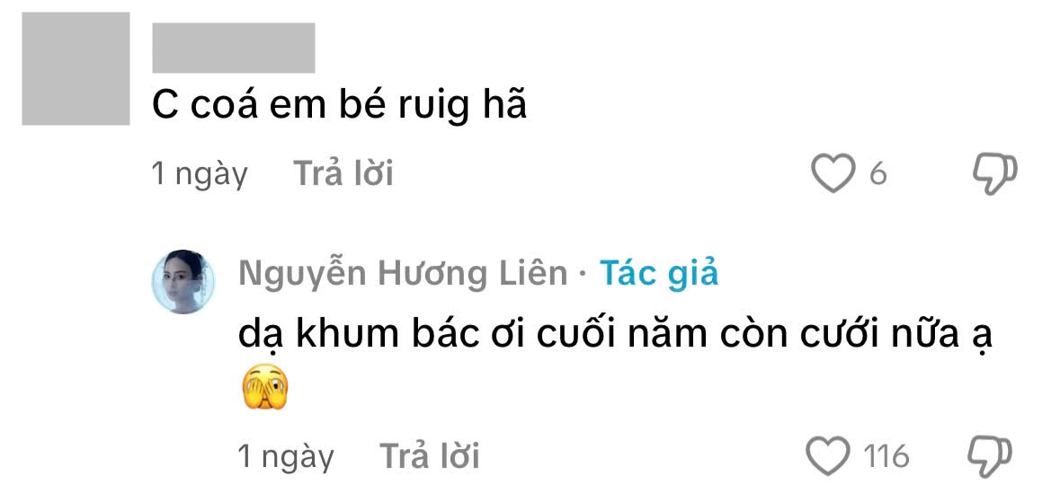 Ở phần bình luận dưới clip này, cô cũng thẳng thắn phản hồi: “Dạ không bác ơi, cuối năm còn cưới nữa ạ” khi được một netizen hỏi: “Có em bé rồi hả”.