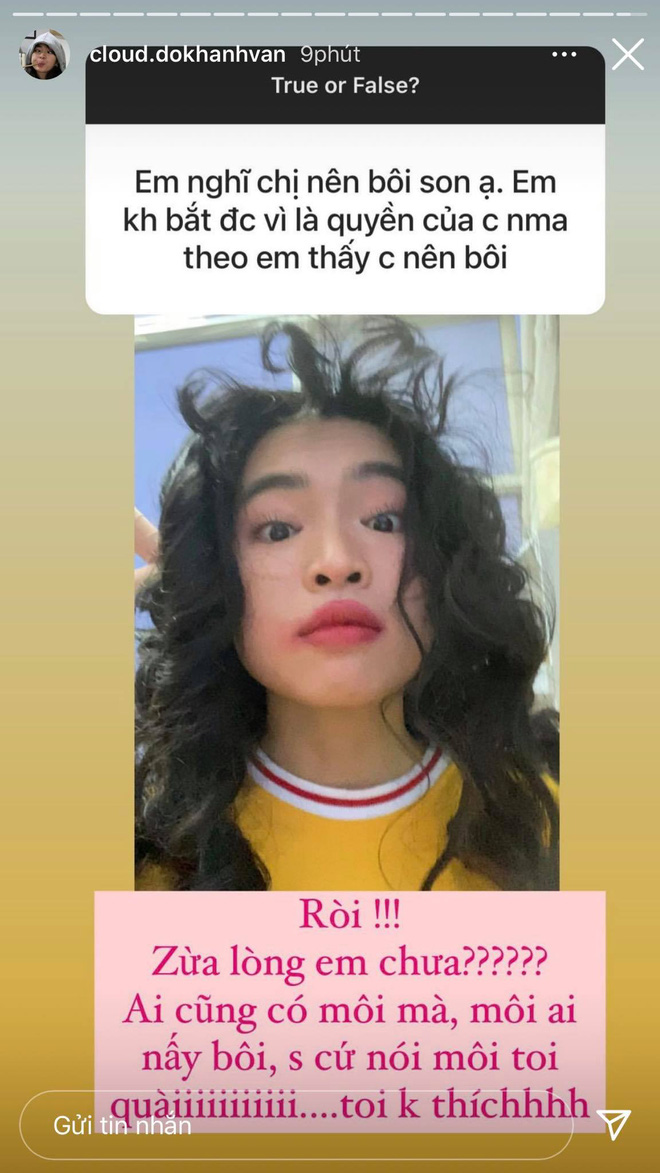 Về chuyện đánh son, cô nàng trả lời bằng hình ảnh vừa thách thức vừa hài hước với đôi môi đánh son nhoe nhoét. Bên cạnh đó, Khánh Vân viết: "Rồi. Vừa lòng em chưa? Ai cũng có môi mà, môi ai nấy bôi, sao cứ nói môi tôi chi quài. Tôi không thích".