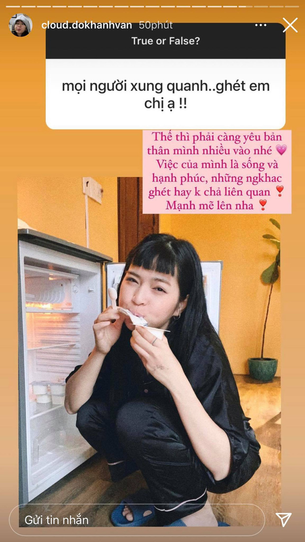 "Thế thì phải càng yêu bản thân mình nhiều vào nhé! Việc của mình là sống và hạnh phúc, những người khác ghét hay không chả liên quan. Mạnh mẽ lên nha".