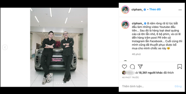 "8 năm ròng rã từ lúc bắt đầu làm những video YouTube đầu tiên... Sau đó là hàng loạt deal quảng cáo cả lớn lẫn nhỏ, 6 bộ phim, và có lẽ đến hàng trăm post PR trên cả Instagram lẫn Facebook... Cuối cùng thì mình cũng đã thuyết phục được bố mua cho mình chiếc xe này".