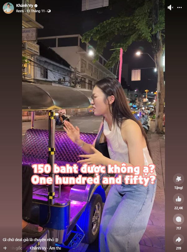 Đặc biệt, cô nàng vừa chia sẻ trải nghiệm đặt xe taxi vừa tiện "flex khéo" kỹ năng ngoại ngữ. Theo đó, nhờ tiếng Anh lưu loát, cộng với sự chân thành và chắc là có phần... "tội nghiệp", mà Khánh Vy và nhóm bạn đã deal được với tài xế taxi giảm giá cho họ. Cô nàng còn lia lịa "OK, Việt Nam love Thái Lan" khiến nhiều người bật cười.