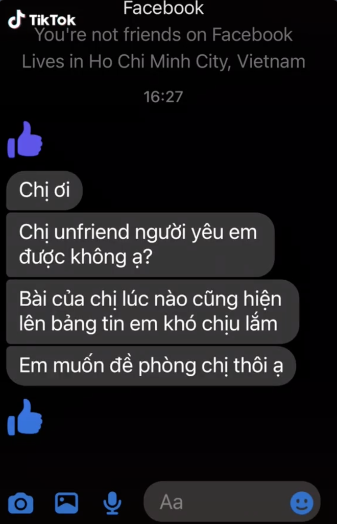 Một ngày nọ, một cô gái lạ mặt, tạm gọi là A. bỗng nhiên nhắn tin cho T.T yêu cầu cô hủy kết bạn với người yêu mình mà không hề giới thiệu bản thân là ai. Lý do A. đưa ra thoạt nghe thì cũng chính đáng đấy nhưng càng đọc lại càng thấy sai sai. "Chị ơi, chị unfriend người yêu em được không ạ? Bài của chị lúc nào cũng hiện lên bảng tin em khó chịu lắm. Em muốn đề phòng chị thôi ạ".