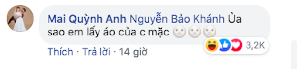 Đáp trả nhẹ nhàng, Mai Quỳnh Anh chỉ thắc mắc: "Ủa, sao em lấy áo của chị mặc?".