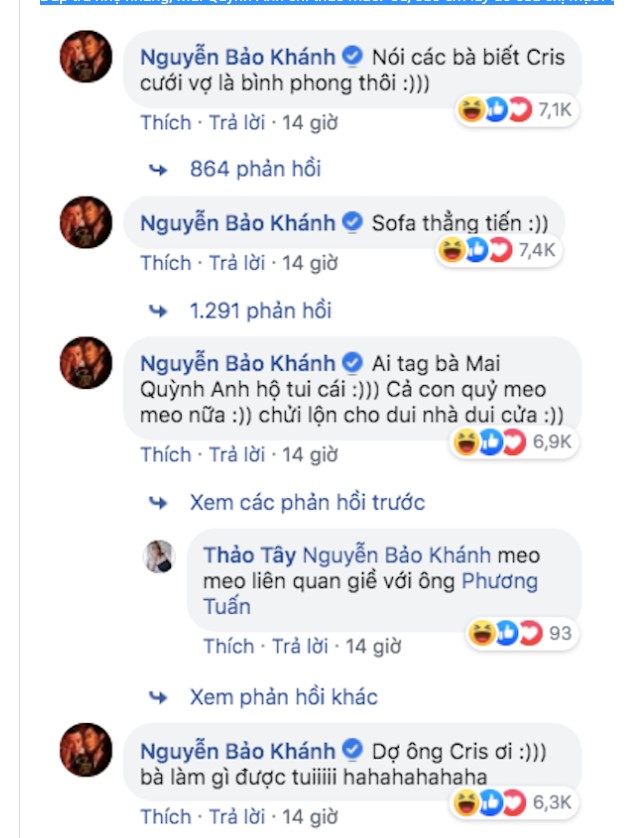 Đặc biệt Khánh K-ICM cũng công khai tag tên Cris Phan vào hình đồng thời tiết lộ bí mật ở phần bình luận: "Nói các bà biết Cris cưới vợ chỉ là bình phong thôi!". Chưa hết, anh chàng còn kêu gọi gắn tên cô vợ xinh đẹp mới cưới của Cris vào để dằn mặt: "Vợ ông Cris ơi, bà làm gì được tui!".