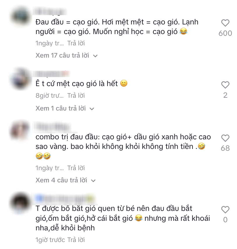 - "Bà nội tôi là trùm, đau bụng cũng bắt gió. Hơi mệt là dùng combo 'thần thánh' dầu gió + nhẫn bạc ".