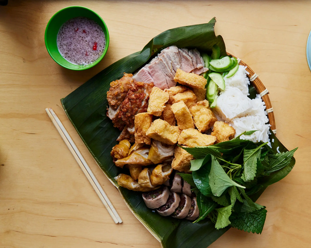 Đậu phụ cũng được chủ quán tự làm từ chiếc máy chuyển trực tiếp từ Việt Nam sang, hay bún lá, dồi lợn, lòng lợn luộc, lòng nướng, chả cốm, thịt luộc hay cả các loại rau sống như diếp cá, tía tô, đều có đầy đủ, tạo nên một mẹt bún đậu "chuẩn Việt" phục vụ trên đất Mỹ. Một suất bún đậu cơ bản có giá 14 đô la Mỹ, còn phần đặc biệt giá 32 đô.