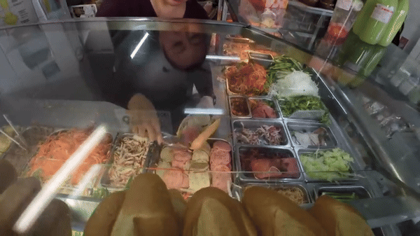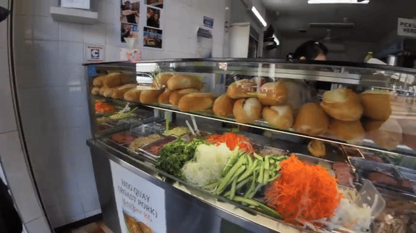 Tại quầy bánh mỳ, những nguyên liệu quen thuộc được bày bán tương tự như một sạp hàng ở Việt Nam. Bên cạnh chiếc bánh mỳ còn có các nguyên liệu khác ăn kèm như thịt heo quay, xíu mại, giò chả, các loại rau củ được bào sợi như dưa chuột, cà rốt, đu đủ xanh, cùng một số loại rau thơm khác... 2 chàng du khách gọi những phần bánh mỳ đặc trưng.