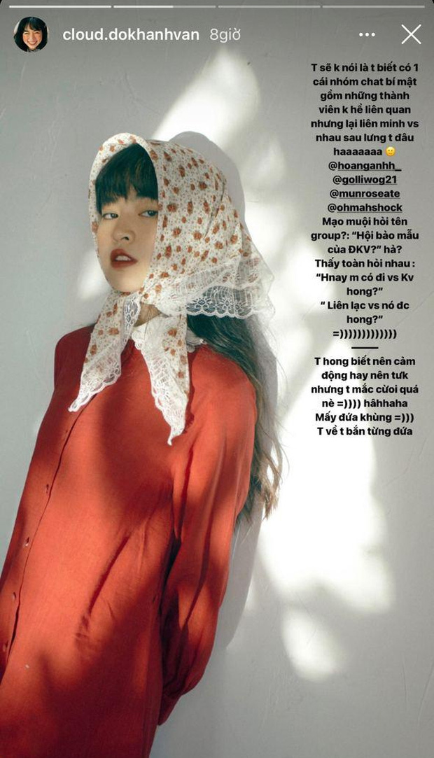 "Tui sẽ không nói là tui biết có 1 cái nhóm chat bí mật gồm những thành viên không hề liên quan nhưng lại liên minh với nhau sau lưng tui đâu. Mạo muội hỏi tên group "Hội bảo mẫu của Đỗ Khánh Vân" hả? Thấy toàn hỏi nhau "Hôm nay mày có đi với Khánh Vân không?", "Liên lạc với nó được không?",...