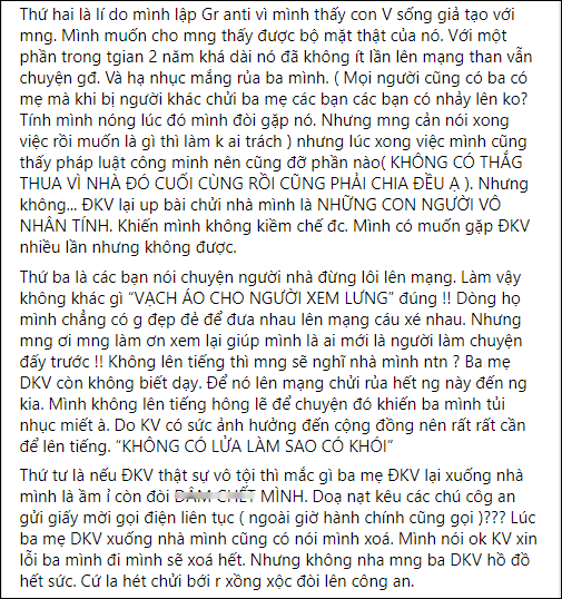 "Ba mẹ Đỗ Khánh Vân quen chú công an chỗ chị mình ở, làm giấy mời chị mình lên trong khi chị mình đang phải nuôi con nhỏ. Thêm một cái nữa, mình là người lập group chứ không phải chị mình nhưng mình không có bất cứ một giấy mời hay giấy triệu tập nào?
