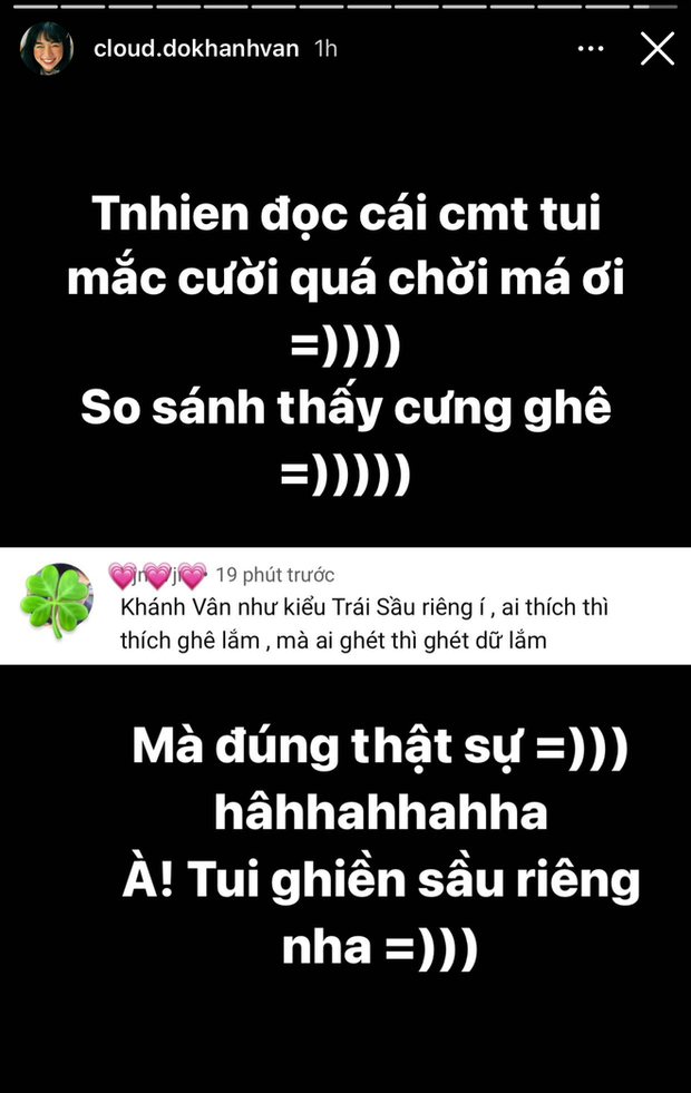 Mới đây, trên story Instagram của mình, Khánh Vân có vẻ như đã mượn khéo một comment của fan để giải thích về vấn đề trên. Bình luận viết: "Khánh Vân như trái sầu riêng ý, ai thích thì thích ghê lắm mà ai ghét thì ghét dữ lắm".