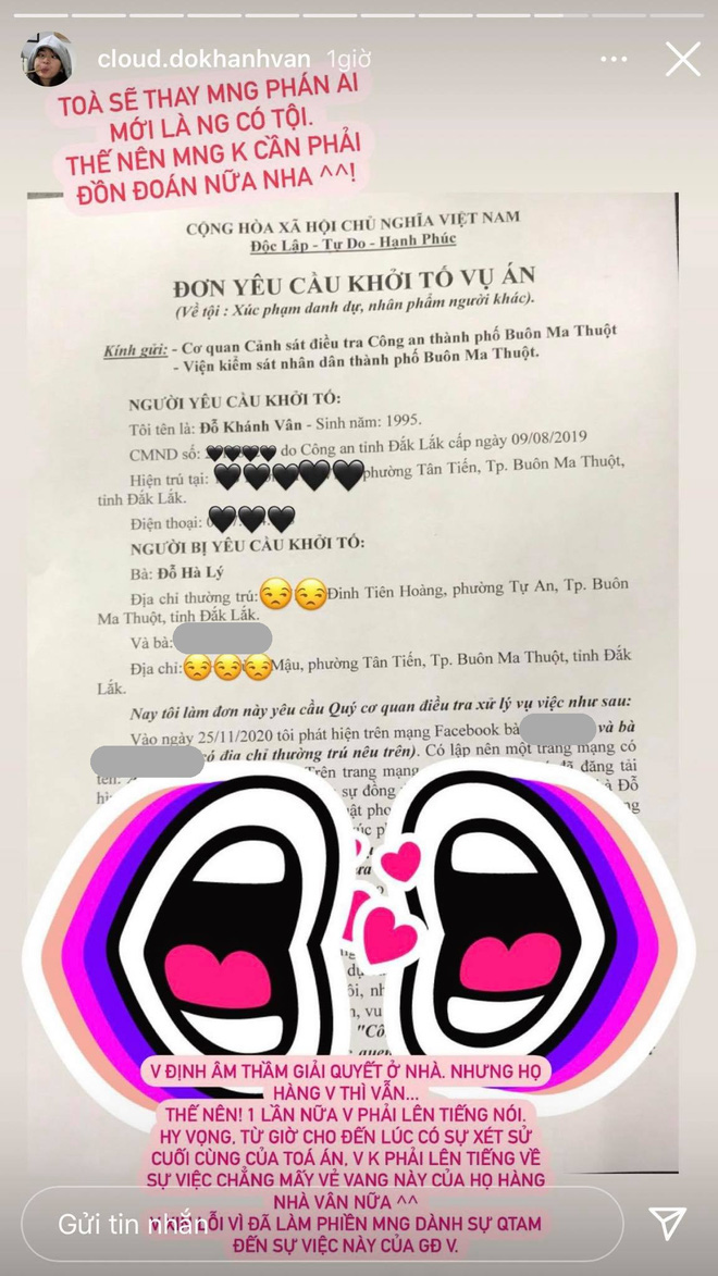 Cũng trong thời gian group anti xuất hiện, dân tình mới biết hóa ra gia đình cô và họ hàng có mâu thuẫn vô cùng lớn trong việc phân chia tài sản. Ngày 11/1 vừa qua cũng là ngày mà Khánh Vân và những người họ hàng của mình đưa nhau ra tòa sau khi cô đâm đơn kiện họ hàng về tội "xúc phạm danh dự, nhân phẩm người khác".