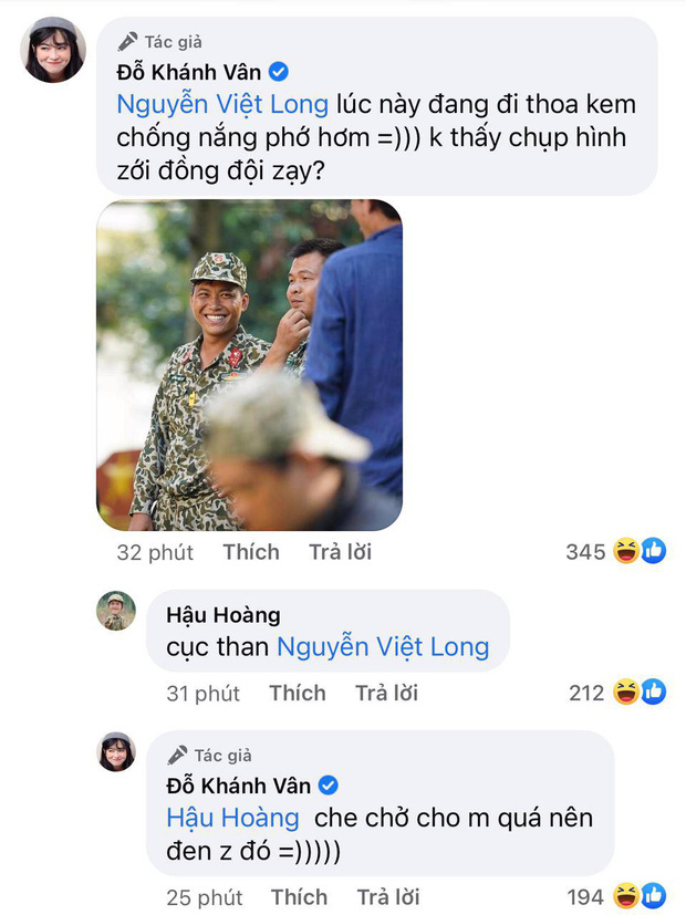 Ngay bên dưới bình luận của Khánh Vân, Hậu Hoàng gọi đồng chí Nguyễn Việt Long một cách thân thương là... cục than. Ngay lúc này, Khánh Vân lập tức đẩy "thuyền": "Che chở cho mày quá nên đen vậy đó".