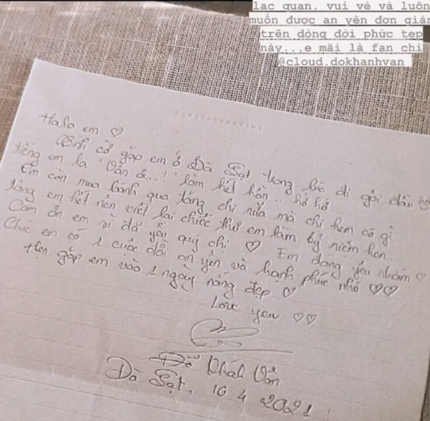 "Halo em. Tình cờ gặp em ở Đà Lạt trong lúc đi gội đầu. Tiếng em la 'Vân ơi...!' làm hết hồn. Em còn mua bánh qua tặng chị nữa mà chị hem (PV: "không") có gì tặng em hết nên viết lại chiếc thư này làm kỷ niệm. Cảm ơn em vì đã yêu quý chị. Em đáng yêu lắm. Chúc em có 1 cuộc đời an yên và hạnh phúc nhé. Hẹn gặp em vào một ngày nắng đẹp".