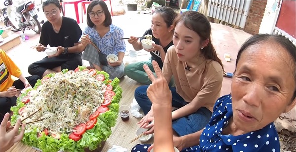 Lần này, bà Tân lại tiếp tục cho ra 'lò' đĩa mì chũ xào khổng lồ - đây là một trong những đặc sản nổi tiếng của Bắc Giang. Xuất hiện trong clip, cô nàng Khánh Vy tỏ ra khá hào hứng và thích thú khi rất hăng hái chuẩn bị từ các nguyên vật liệu rồi nấu ăn cùng bà Tân.