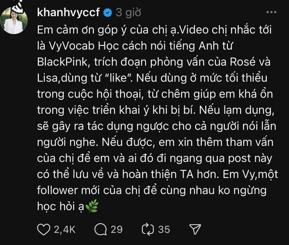 Trái với quan điểm của Khánh Vy, nhiều người cho rằng việc sử dụng từ đệm nghe tưởng sang nhưng thực tế chỉ khiến người nghe đánh giá bạn nói mà không suy nghĩ kỹ, bí từ vựng, lắp bắp và không rõ ràng. "KOL kiểu này thì sợ quá ạ. 'Like' là một filler word - từ đệm. Học tiếng Anh/communication (giao tiếp - PV) ai cũng khuyến khích bỏ filler word đi còn không xong, mình đi khuyên nhau thêm 'like' vào cho sang! Không hiểu gì mà cứ copy blindly (sao chép một cách mù quáng - PV) là kỳ lắm nha. Xin Khánh Vy hãy level up (lên trình - PV) lên em", một tài khoản Threads chia sẻ.