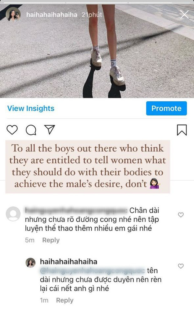 Một màn phản dame cực gắt khác đến từ hội gái xinh thuộc về Hải Hà - bạn gái Rocker Nguyễn. Chuyện là khi một người đã bình luận về vóc dáng của cô nàng rằng chân dài nhưng chưa rõ đường cong, Hải Hà đã "cà khịa" lại: "Tên dài nhưng chưa được duyên nên rèn cái nết lại anh nhé".