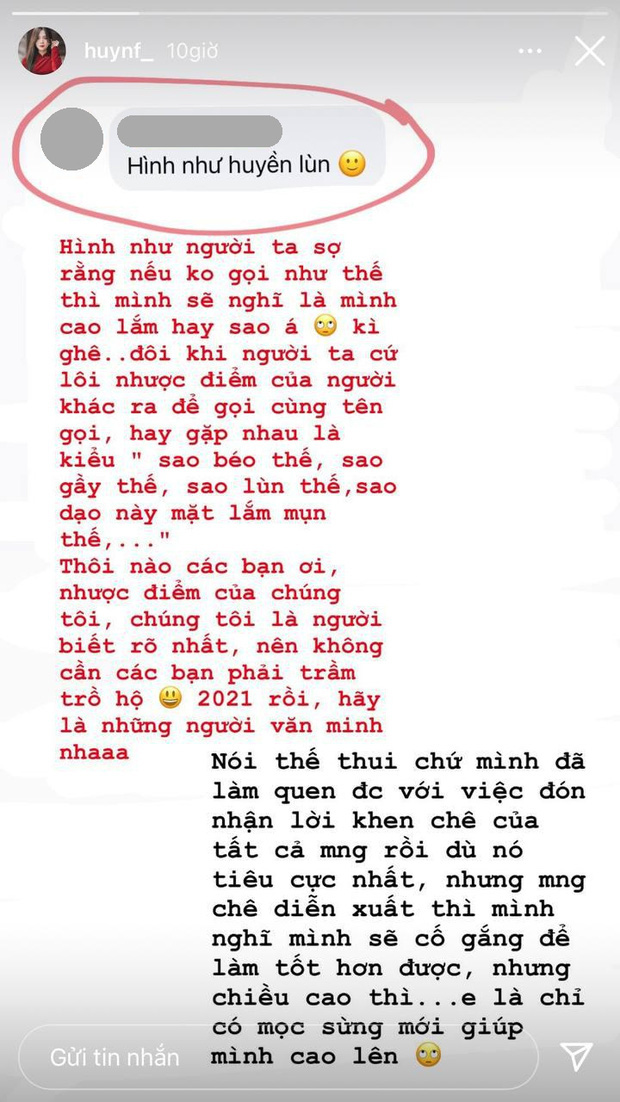 Cụ thể khi ai đó nhắn tin chỉ ra dấu vết photoshop trong ảnh sống ảo, Trâm Anh chẳng buồn rep mà lại cap màn hình và đăng story: "Kệ tôi đi", bày tỏ việc không quan tâm.
