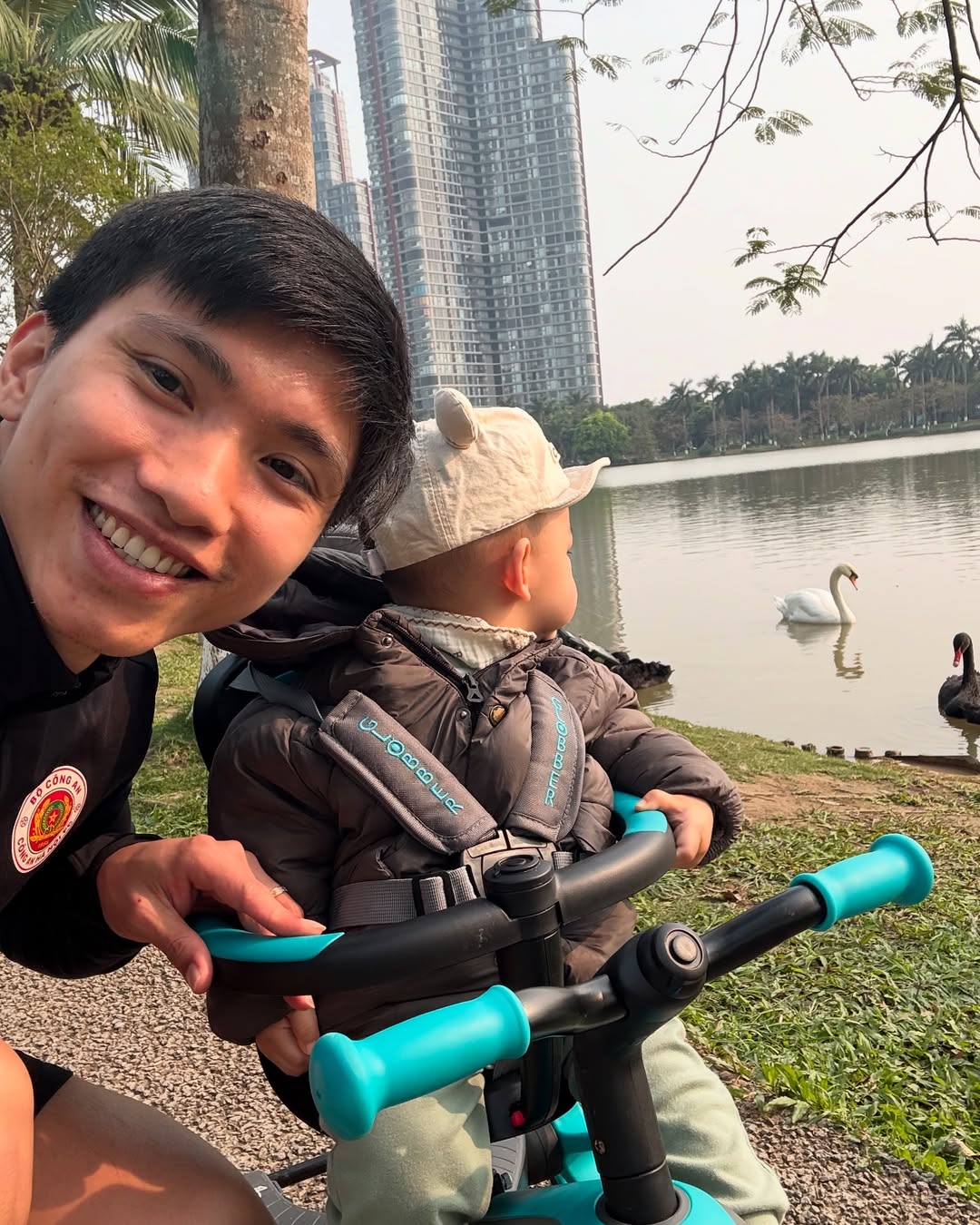 Ngoài ra, khoảnh khắc khiến dân mạng thích thú là màn trình diễn "bốc đầu" của hai bố con Văn Hậu - Minh Đăng khi đi dạo. Đặt nhóc tỳ ngồi lên chiếc xe đẩy, Văn Hậu uyển chuyển đẩy xe cho con và thỉnh thoảng còn làm vài cú "bốc đầu" khiến bánh xe phía trước nâng cao hơn so với mặt đất. Với sức khoẻ của Văn Hậu, anh hoàn toàn có thể kiểm soát nhịp chuyển động của chiếc xe để đảm bảo an toàn cho con trai cưng. Cả hai bố con khi thực hiện màn "bốc đầu" này đều cười vui vẻ.