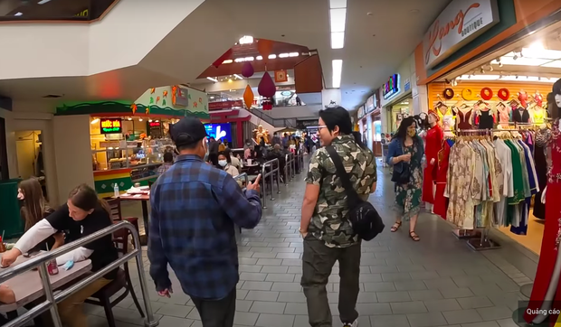 Khoa Pug chia sẻ, tại khu vực này rất đông người Việt, gần như có thể giao tiếp, mua bán, làm dịch vụ 100% bằng tiếng Việt. Sau khi ăn sáng xong, anh và cameraman mới tiếp tục đi khám phá Quận Cam. Điểm đến tiếp theo là trung tâm thương mại Phước Lộc Thọ.