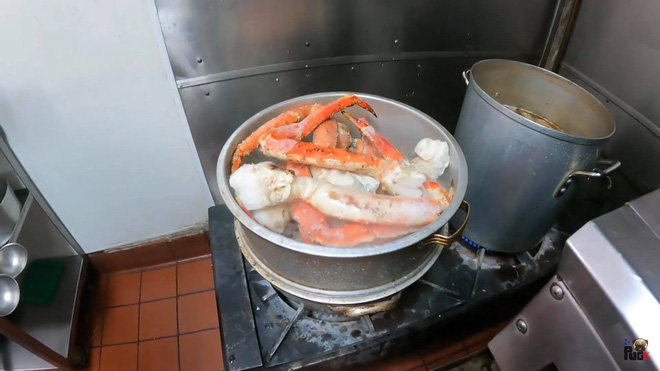 Trong hộp cua hoàng đế có khoảng 10 chiếc chân và 2 cái càng. Khoa Pug bất ngờ vì cái nào cũng rất to và dài nguyên bằng cánh tay. Cua đã được làm sẵn trước đó nên chỉ việc hấp lại là có thể ăn ngay.