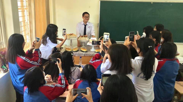 Dù lớp học chỉ có 1 nam xong cậu bạn vẫn mua rất nhiều bánh ngọt lẫn bánh gato cho các bạn nữ. Khỏi phải nói, hội nữ sinh cảm động thế nào, liền yêu cầu cậu bạn đứng chính giữa để chụp ảnh lưu niệm mới được.