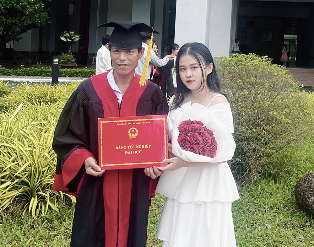 Ông Lê Minh Dương (49 tuổi, cha của Thy) cho biết, rất xúc động và ấm lòng trước hành động khoác áo cử nhân của con gái.