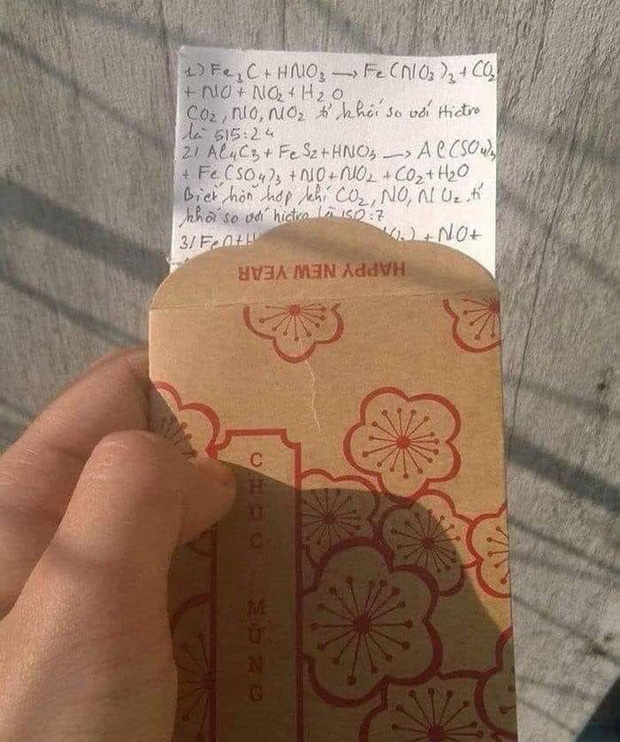 Tất nhiên theo lẽ thông thường bên trong mỗi bao lì xì sẽ là tiền lì xì mà người lớn khéo léo chuẩn bị sẵn để mừng tuổi lấy may đầu năm cho các con các cháu. Tuy nhiên, đến bức ảnh này, ai nấy đều bất ngờ vì bên trong bao lì xì xuất hiện tấm giấy ghi dày đặc công thức, phương trình, bài tập hoá học.