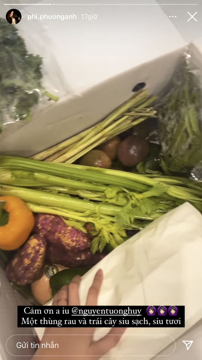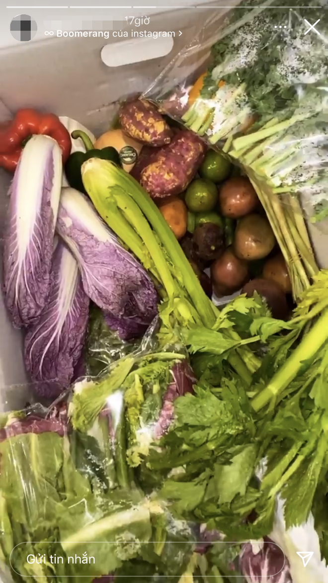 Không những thế, cả 2 cũng cùng khoe thùng rau củ quả được người thân gửi cho trong mùa dịch. Một lần nữa những món rau củ của 2 người giống nhau y hệt và được đăng cùng thời gian.