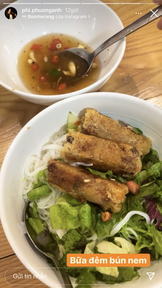 Cụ thể, vào khoảng gần nửa đêm hôm qua, gái đẹp họ Phí khoe bữa đêm là món bún nem. Gần như cùng lúc, thiếu gia Sài thành cũng đăng ảnh y hệt được đặt trên mặt bàn y hệt Phí Phương Anh.