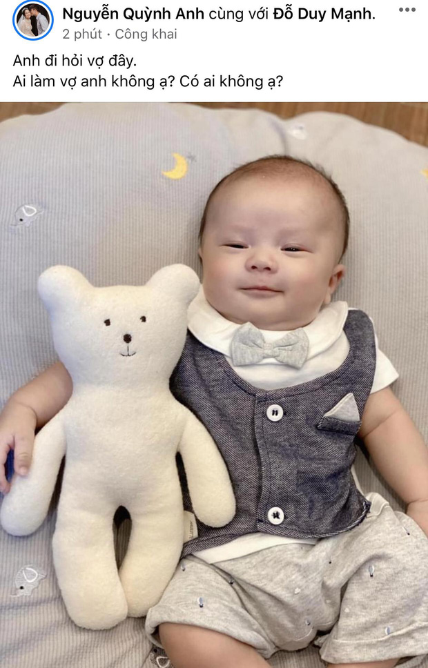 Đặc biệt, vào tối nay (4/10), Quỳnh Anh còn thoải mái công khai hình ảnh mới nhất của con trai lên MXH. Có thể thấy, bé Ú Béo được mẹ diện đồ bảnh bao, mới 2 tháng đã trộm vía cứng cáp và bụ bẫm vô cùng. Không chỉ khoe con, bà xã Quỳnh Anh còn tranh thủ "kén" con dâu luôn: "Anh đi hỏi vợ đây. Ai làm vợ anh không ạ? Có ai không ạ?" khiến dân tình thích thú. Dưới phần bình luận, các cô chú liên tục để lại bình luận khen ngợi, thậm chí còn đòi "góp gạo" đợi soái ca nhí lớn.